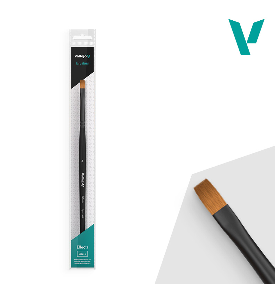 Effect Brush №4 – плаский пензлик із синтетичного ворсу від Acrylicos Vallejo, чий м’який і гнучкий синтетичний ворс ідеальний для нанесення базових кольорів на моделі та мініатюри, а також для малювання прямих ліній.
