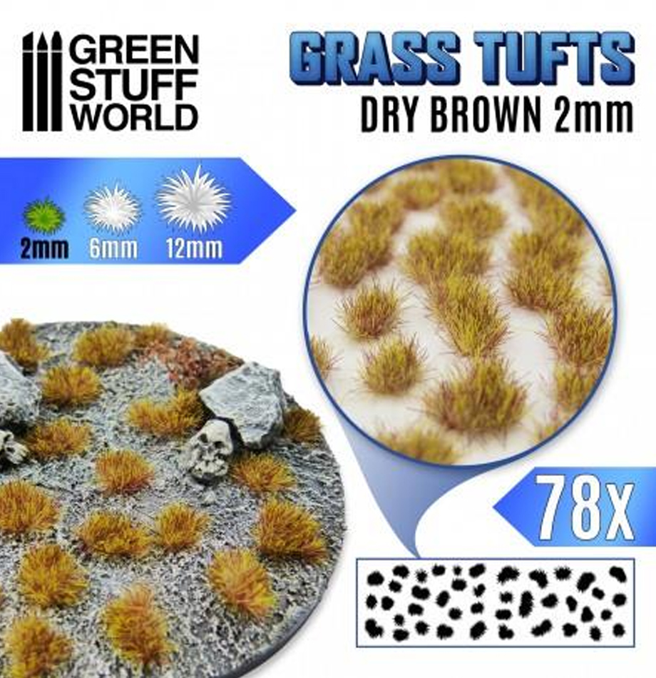 Світло-коричневі пучки Grass Tufts: Dry Brown 2mm – інноваційні декорації від Green Staff World на самоклеючій основі ідеально підходять для оформлення баз мініатюр, декорацій, польових доріжок, озер, берегів річок, набережних і схилів, а також узлісся і доріг, для створення клумб або освітлення лугів.