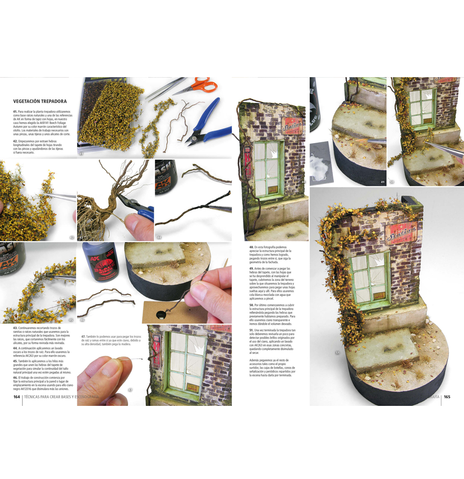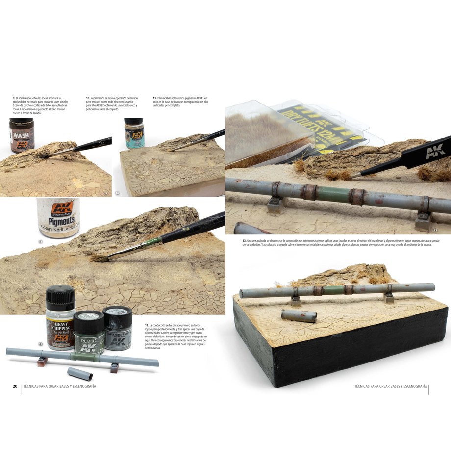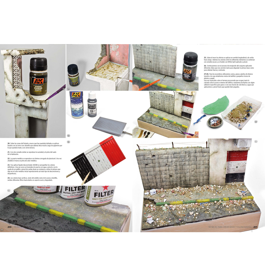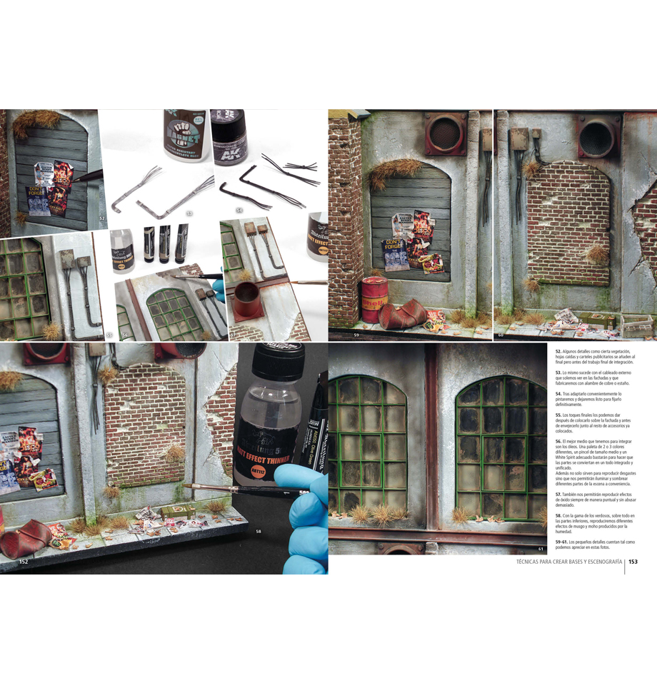У навчальному посібнику Techniques for creating Bases and Scenography ви не знайдете великих діорам чи віньєток, які розповідають складні історії з безліччю елементів, фігур чи транспортних засобів на різних рівнях. Це не означає, що зміст цієї книги не має сенсу. Зовсім навпаки. При її створенні автори підійшли до її мети з іншого боку питання. На сторінках посібника ви знайдете приклади створення невеликих сцен, іноді без фігур і транспортних засобів, але з деталями, прийомами і цікавинками з чіткою дидактичною метою, які можуть розбудити уяву читача і його бажання ввести ці маленькі деталі, про які максимально подбали, у свої роботи.