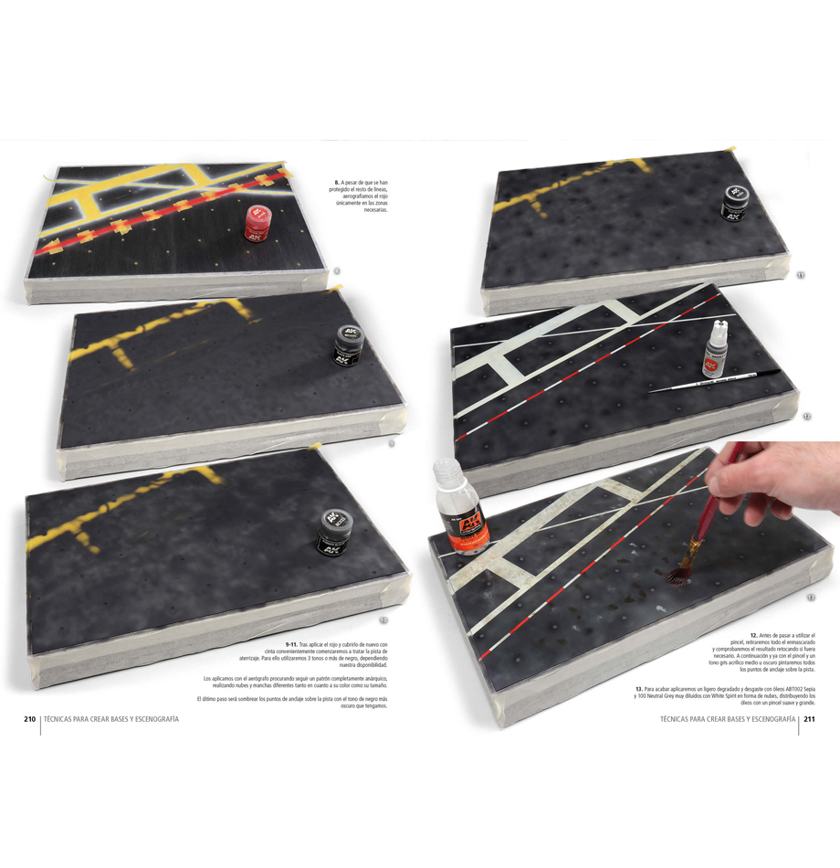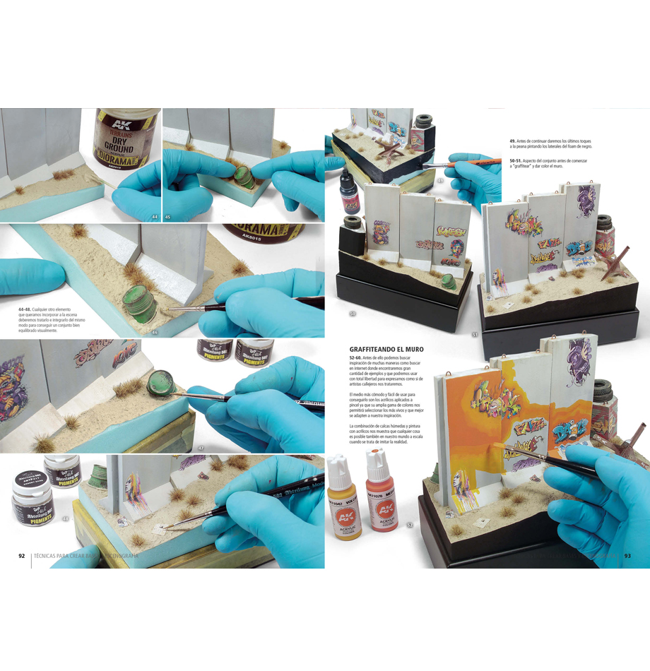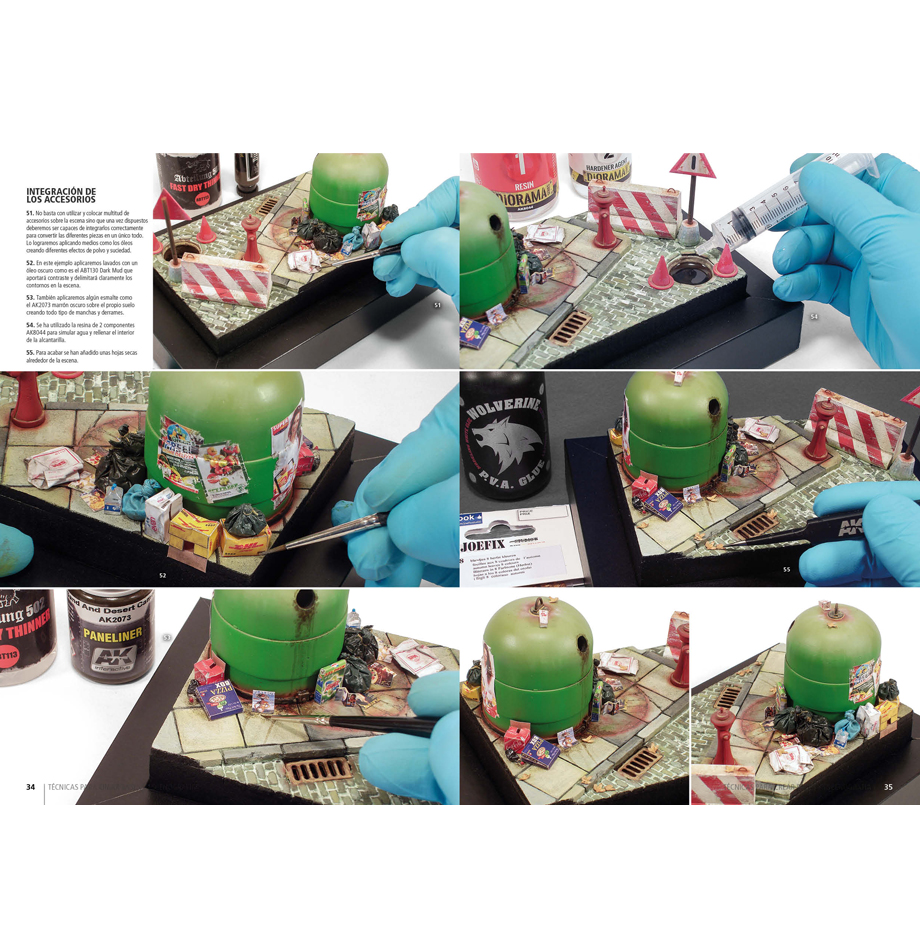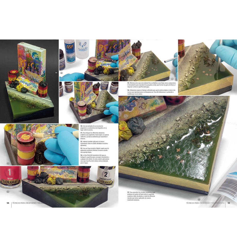 У навчальному посібнику Techniques for creating Bases and Scenography ви не знайдете великих діорам чи віньєток, які розповідають складні історії з безліччю елементів, фігур чи транспортних засобів на різних рівнях. Це не означає, що зміст цієї книги не має сенсу. Зовсім навпаки. При її створенні автори підійшли до її мети з іншого боку питання. На сторінках посібника ви знайдете приклади створення невеликих сцен, іноді без фігур і транспортних засобів, але з деталями, прийомами і цікавинками з чіткою дидактичною метою, які можуть розбудити уяву читача і його бажання ввести ці маленькі деталі, про які максимально подбали, у свої роботи.